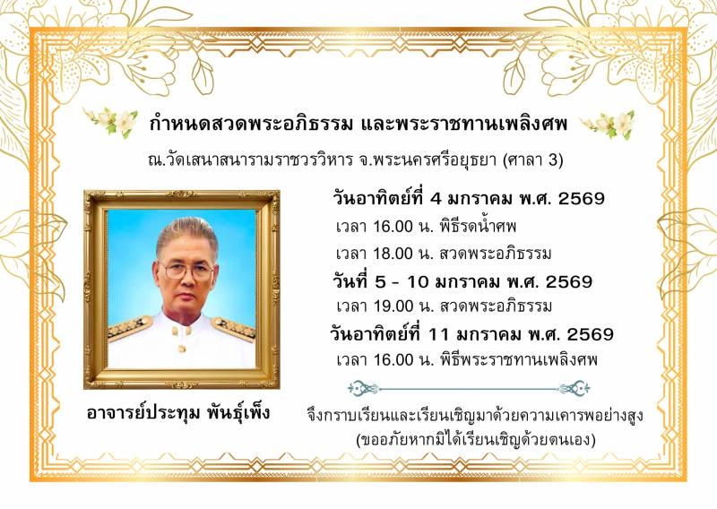 เวลา 16.00 น. พิธีพระราชทานเพลิงศพ อาจารย์ประทุม พันธุ์เพ็ง จึงกราบเรียนและเรียนเชิญมาด้วยความเคารพอย่างสูง (ขออภัยหากมิได้เรียนเชิญด้วยตนเอง)