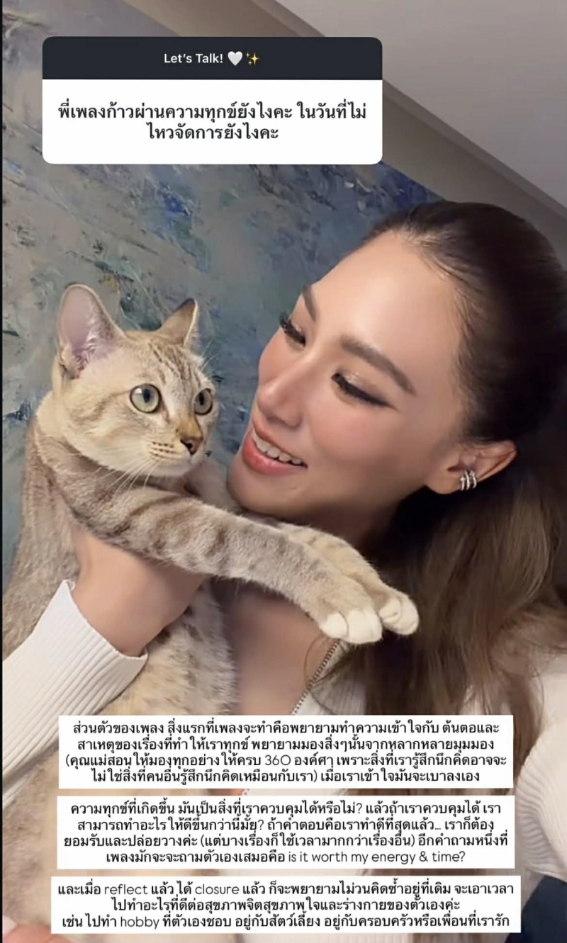 แฟนๆ หลายคนสนใจเรื่องความรัก ทั้งการรับมือกับความเจ็บปวด การ Move On และวิธีจัดการเมื่อถูกคนรักนอกใจ เพลง ได้แชร์วิธีของตัวเองว่า เริ่มจากทำความเข้าใจต้นเหตุของความทุกข์ มองสถานการณ์หลายมิติ และถามตัวเองว่า พลัง และเวลาที่เสียไปคุ้มค่าหรือไม่ เมื่อได้คำตอบก็จะพยายามปล่อยวาง และมุ่งไปกับสิ่งที่ช่วยให้ใจสงบ