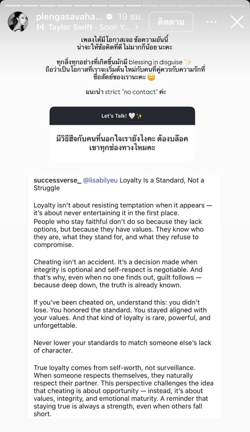 เมื่อเจอคนที่นอกใจ เพลง แนะนำให้ตัดขาดการติดต่ออย่างเด็ดขาด มองว่า ประสบการณ์นี้เป็นโอกาสให้เริ่มต้นใหม่กับคนที่เหมาะสม พร้อมเน้นการรักตัวเองอย่างเต็มที่ และตั้งขอบเขตของความสัมพันธ์ เพื่อให้ใจปลอดภัย