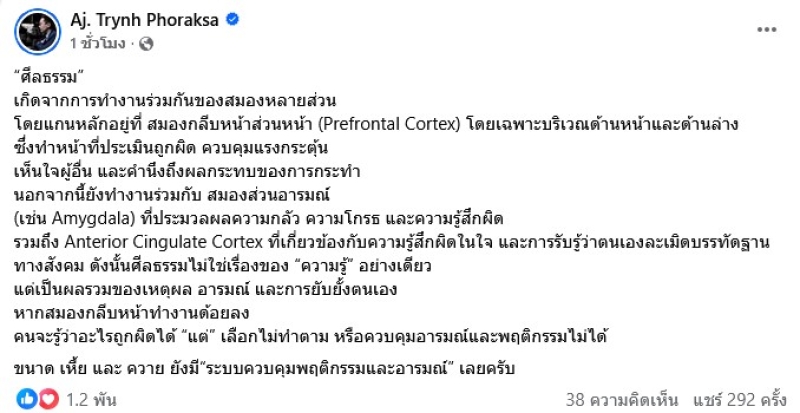 เรียกได้ว่า มาแรงตลอดสำหรับคนนี้ ดร.ตฤณห์ โพธิ์รักษา ที่ล่าสุด ได้ออกมาโพสต์ผ่านfacebookส่วนตัว โดยได้เผยว่า “ศีลธรรม” เกิดจากการทำงานร่วมกันของสมองหลายส่วน โดยแกนหลักอยู่ที่ สมองกลีบหน้าส่วนหน้า (Prefrontal Cortex) โดยเฉพาะบริเวณด้านหน้าและด้านล่าง ซึ่งทำหน้าที่ประเมินถูกผิด ควบคุมแรงกระตุ้น