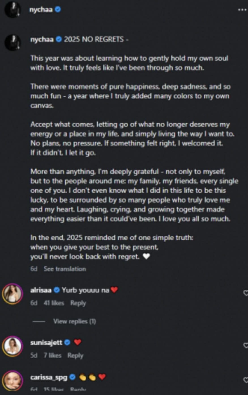 นอกจากนี้ ณิชา ยังส่งคำขอบคุณไปถึงคนรอบตัว ทั้งครอบครัว เพื่อนสนิท และแฟนๆ ที่เป็นพลังสำคัญในทุกช่วงเวลา ย้ำว่า การมีคนที่เข้าใจและรักในตัวตนของกันและกัน ทำให้การเดินทางในปีนี้อบอุ่นกว่าที่คิด