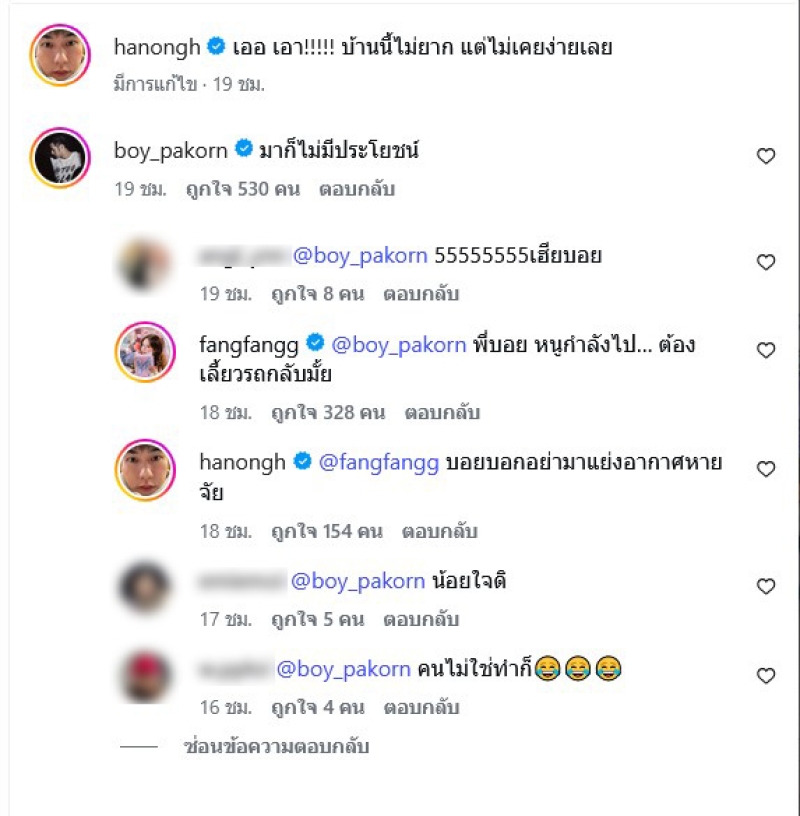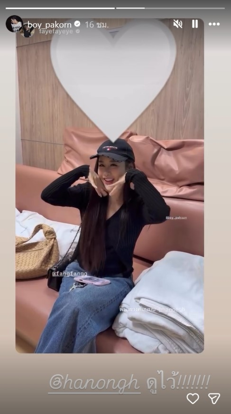 ต่อมา บอย ได้แชร์โพสต์ของเฟย์แฟนสาว เป็นคลิปของ ฟาง ก็มาเยี่ยม บอย ด้วย พร้อมแท็กไอจี หน่อง ข้อความด้วยว่า “ดูไว้!!!!!!!” โดยในคลิป ฟาง โมเมนต์น่ารักก็พูดยิ้มๆด้วยว่า น้องรักคนใหม่ โดย บอย ยังพูดด้วยว่า ไอ้หน่อง ไม่ต้องมาหรอก ยิ่งตอกย้ำที่แฟนๆต่างเชียร์กันมาก