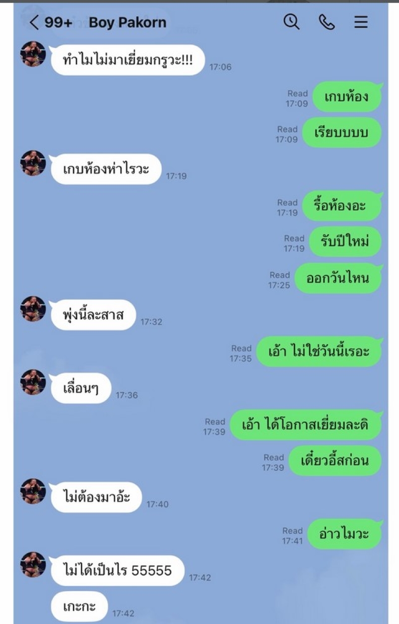 ล่าสุด หน่อง ได้โพสต์แชท บอย ถามทำไมไม่มาเยี่ยม อ่านแชทแล้วกวนกันตามสไตล์ สรุปอยากให้ไปเยี่ยมหรือไม่อยากให้ไปเยี่ยมแน่ พร้อมแคปชั่นว่า “เออ เอา!!!!! บ้านนี้ไม่ยาก แต่ไม่เคยง่ายเลย” ซึ่งก่อนหน้านั้น ทางบอย ได้เข้าโรงพยาบาลเพราะผ่าตัด ซึ่งทางบอยได้มาคอมเมนต์ว่า มาก็ไม่มีประโยชน์ จากนั้นฟางก้มาคอมเมนต์ต่อว่า พี่บอย หนูกำลังไป… ต้องเลี้ยวรถกลับมั้ย ด้านหน่องก็ไม่น้อยหน้า รีบมาตอบกลับฟางว่า บอยบอกอย่ามาแย่งอากาศหายจัย