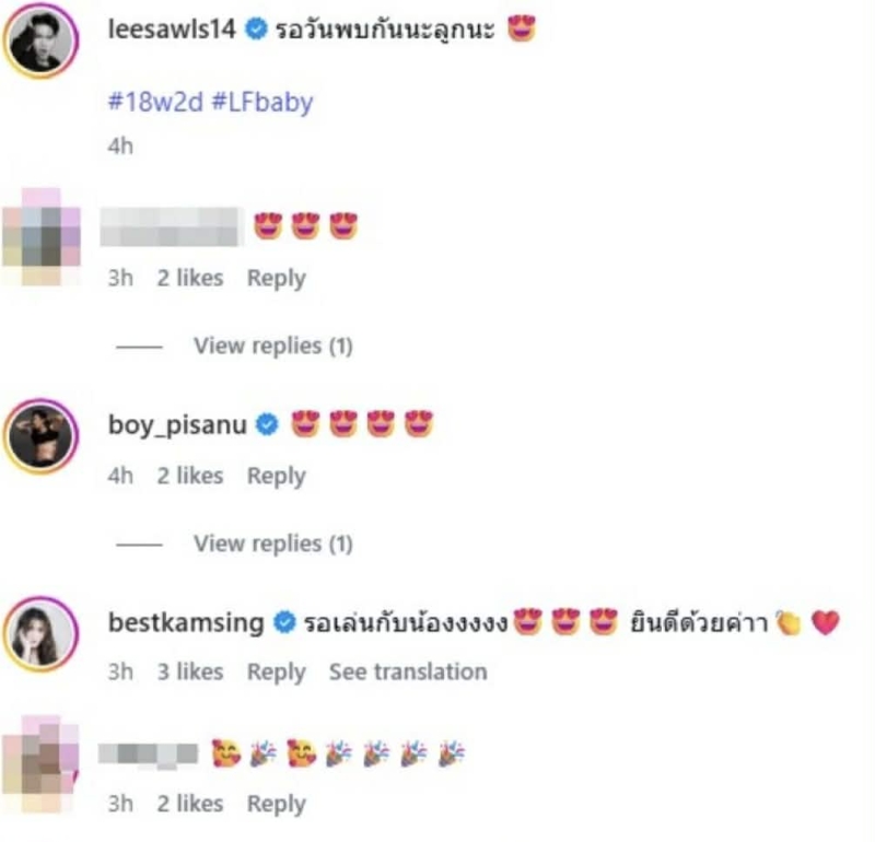 ด้านคนบันเทิง และผู้ติดตามต่างพร้อมใจกันเข้ามาแสดงความยินดีอย่างต่อเนื่อง ร่วมส่งกำลังใจให้ครอบครัวนี้รอวันพบหน้าทายาทตัวน้อยด้วยความสุขใจ