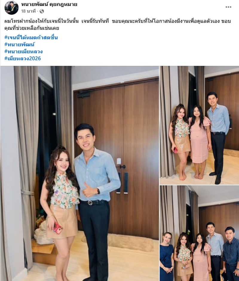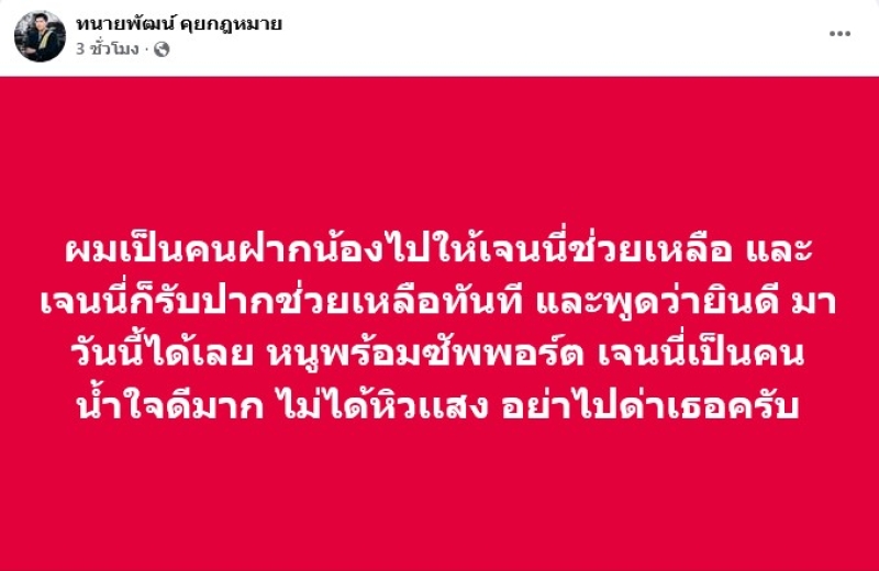 และโพสต์ล่าสุดของทนาย ก็เผยอีกว่า ผมโทรฝากน้องให้กับเจนนี่ในวันนั้น เจนนี่รับทันที ขอบคุณนะครับที่ให้โอกาสน้องมีงานเพื่อดูแลตัวเอง ขอบคุณที่ช่วยเหลือกันเช่นเคย