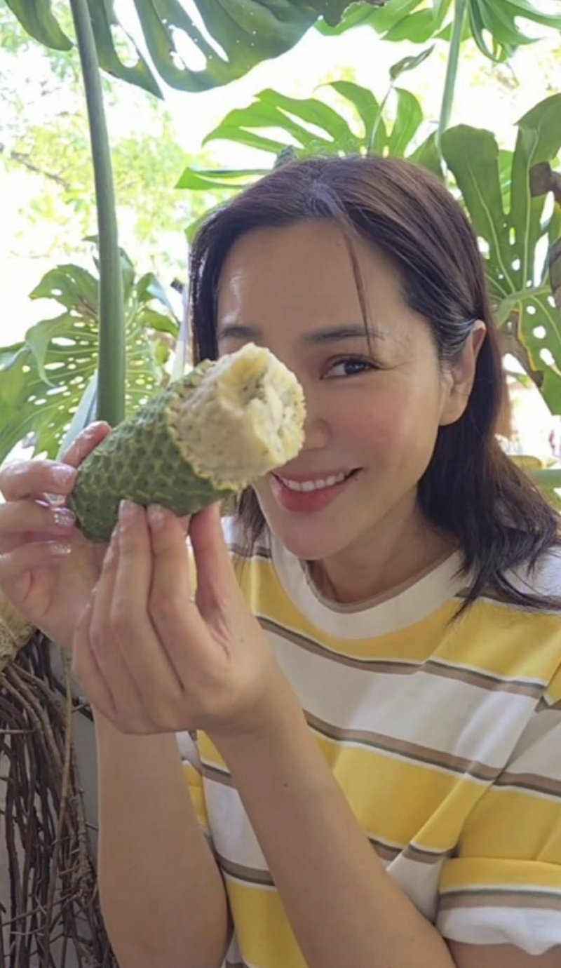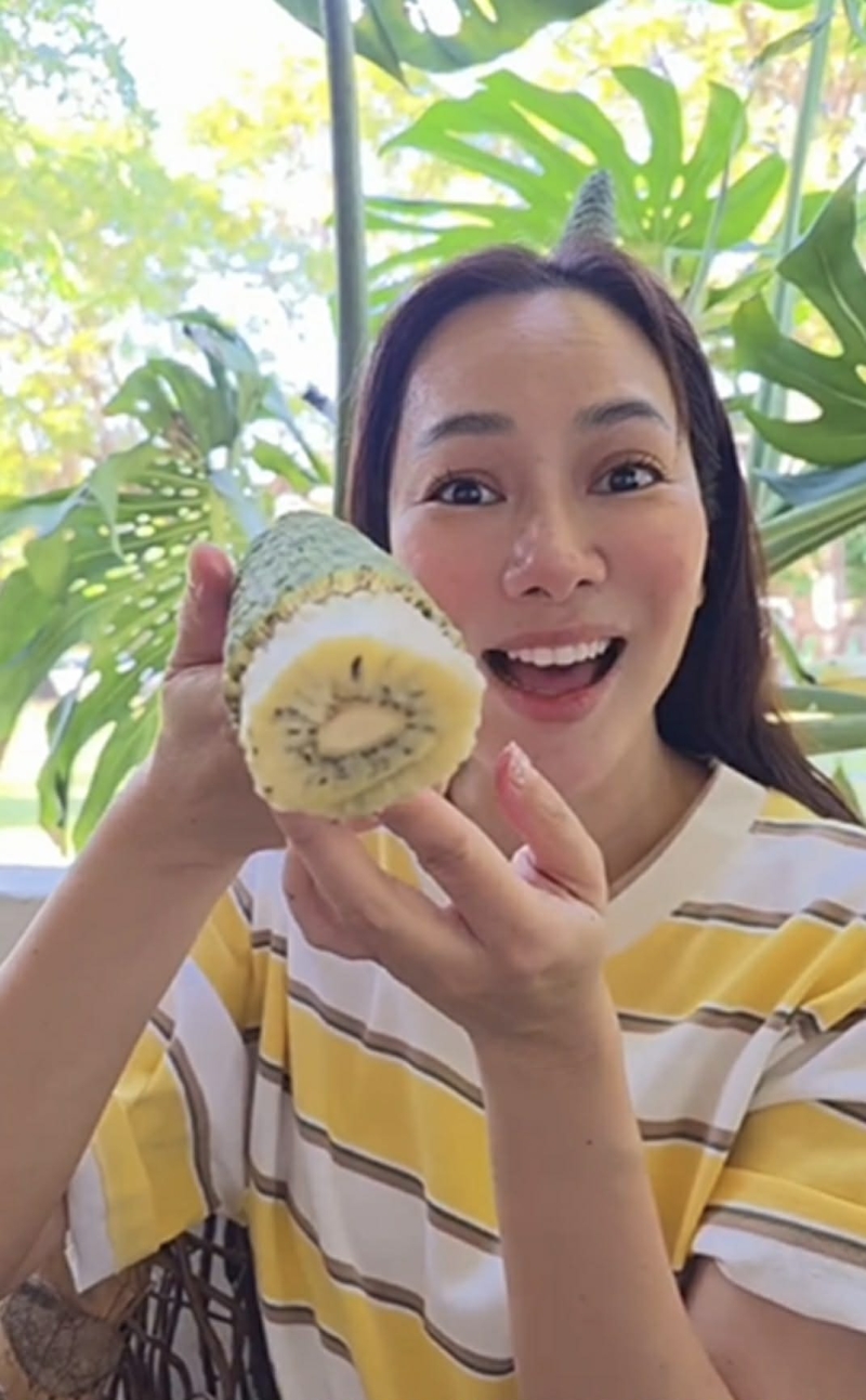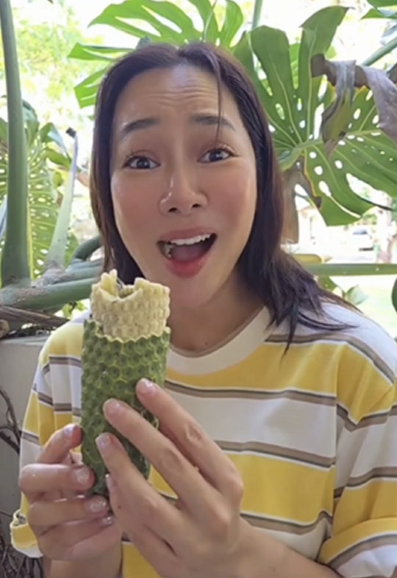 โดย เธอ เล่าว่า รสชาติของผลมอนสเตอร่าสุก มีความหวานอมเปรี้ยว กลิ่นหอมเฉพาะตัว และเนื้อสัมผัสนุ่มฉ่ำ แต่ก็มีช่วงที่เผลอรับประทานส่วนที่ยังไม่พร้อม ส่งผลให้เกิดความระคายเคืองเล็กน้อยในช่องปาก จนต้องหาวิธีบรรเทาอาการกันแบบขำๆ