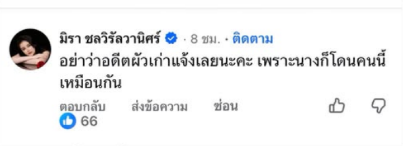 จากกรณีที่ก่อนหน้านี้ เอ๋ มิรา ได้ออกมาโพสต์ฟาดเดือดระบุว่า พอดีมีหมาไปร้องเรียนให้สรรพากรมาตรวจสอบหนูค่ะ วันนี้เลยเข้าไปพบเจ้าหน้าที่ เจ้าหน้าที่น่ารักมากค่ะ อธิบายทุกอย่างให้หนูเข้าใจ หนูจ่ายภาษีถูกต้องตามกฏหมาย หมามันเลยได้แค่เห่า กัดไม่ได้ ไปทำสวนต่อดีกว่าค่ะ เสียเวลาชีวิต #ขอบคุณที่ใส่ใจหนูขนาดนี้นะคะ ทำตัวไม่น่าเคารพเลยน๊า
