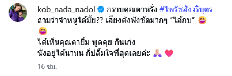 พร้อมเขียนแคปชั่นระบุว่า กราบคุณตาหรั่ง #ไพรัชสังวริบุตร ถามว่าจำหนูได้มั้ย?? เสียงดังฟังชัดมากๆ ไอ้กบ ได้เห็นคุณตายิ้ม พูดคุย กินเก่ง นั่งอยู่ได้นานน ก็ปลื้มใจที่สุดเลยค่ะ