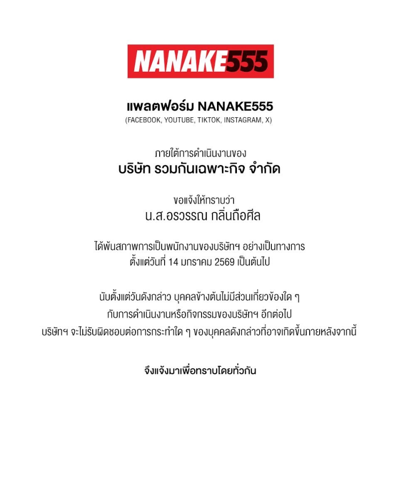 ขอแจ้งให้ทราบว่า น.ส.อรวรรณ กลิ่นถือศีล ได้พ้นสภาพการเป็นพนักงานของบริษัทฯ อย่างเป็นทางการ ตั้งแต่วันที่ 14 มกราคม 2569 เป็นต้นไป นับตั้งแต่วันดังกล่าว บุคคลข้างต้นไม่มีส่วนเกี่ยวข้องใดๆ กับการดำเนินงานหรือกิจกรรมของบริษัทฯ อีกต่อไป