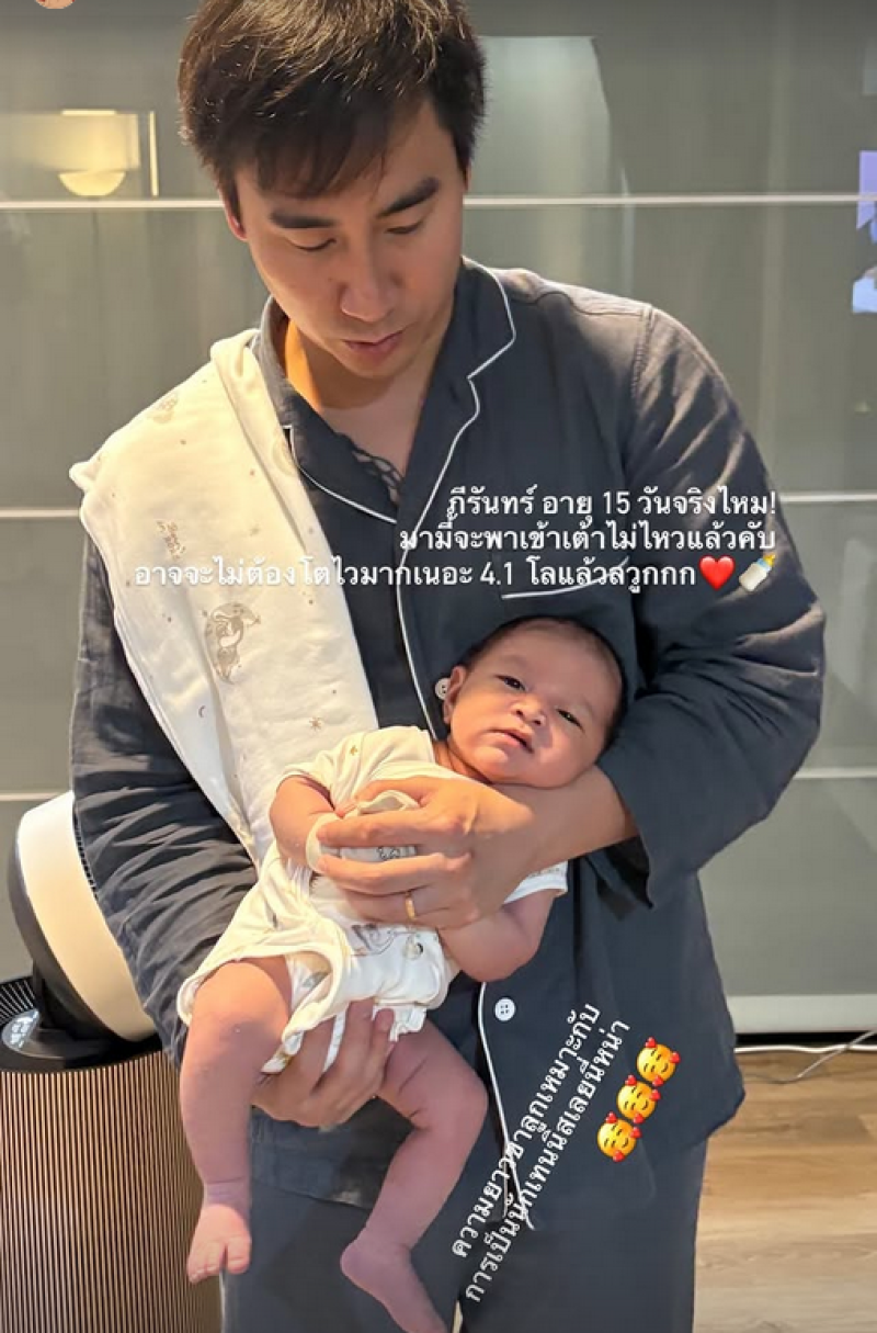 พร้อมเขียนแคปชั่นที่แอบใจหายอยู่ไม่น้อยว่า ภีรันทร์ อายุ 15 วันจริงไหม! มามี้จะพาเข้าเต้าไม่ไหวแล้วคับ อาจจะไม่ต้องโตไวมากเนอะ 4.1 โลแล้วลวูกกก, ความยาวขาลูกเหมาะกับการเป็นนักเทนนิสเลยนี่หน่า