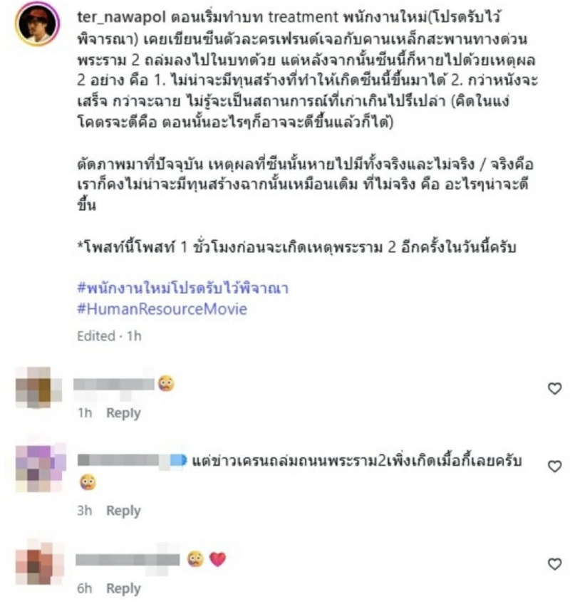 อีกทั้ง เจ้าตัว ยังย้อนเล่าถึงช่วงพัฒนาบทภาพยนตร์เรื่องหนึ่ง ซึ่งเคยมีฉากเกี่ยวกับอุบัติเหตุบนทางด่วนพระราม 2 แต่สุดท้ายถูกตัดออก ด้วยข้อจำกัดด้านการผลิต และความหวังในเวลานั้นว่า สถานการณ์จริงอาจคลี่คลายไปในทางที่ดีขึ้น