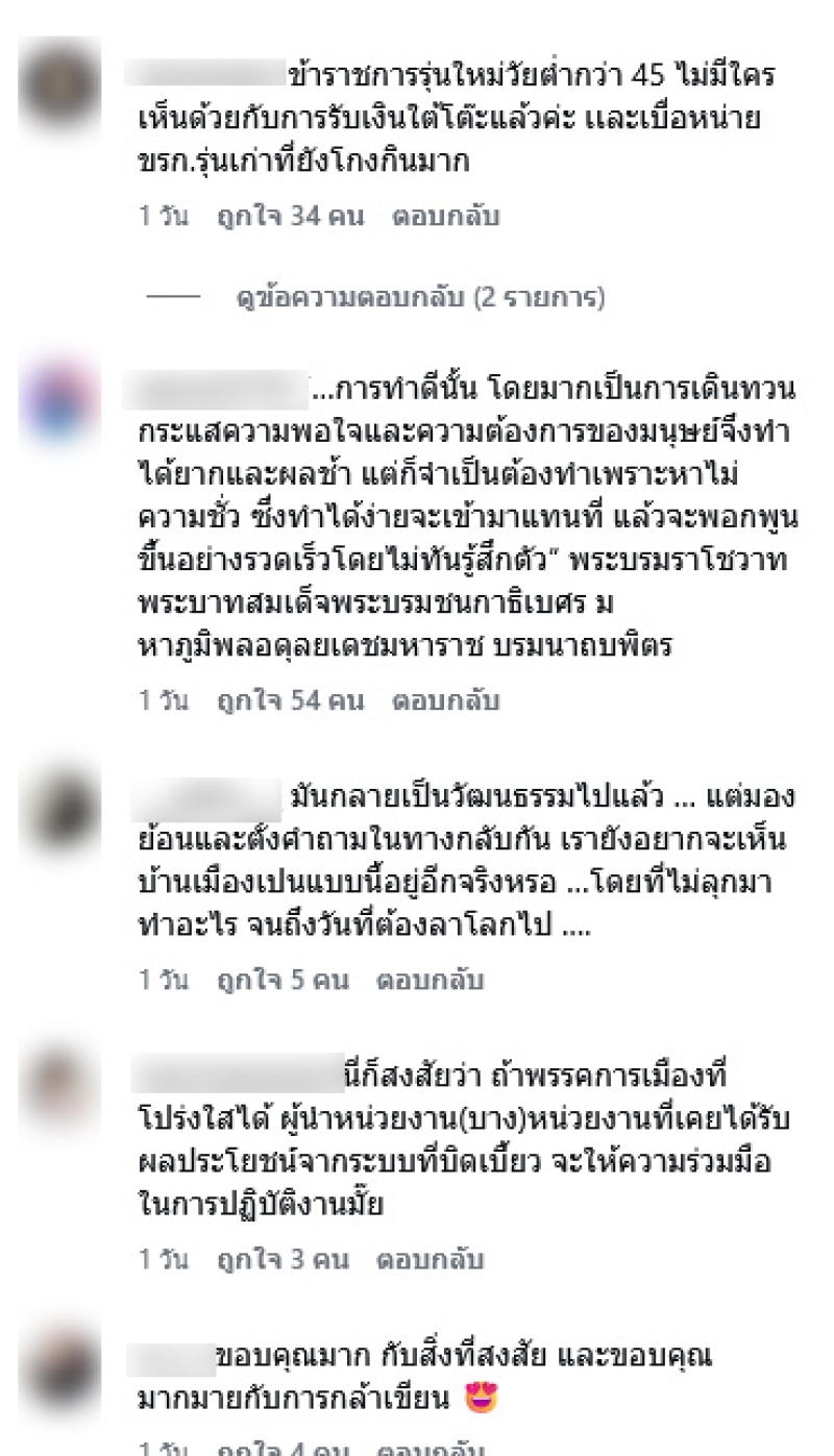 หากเขาไม่มีช่องทางในการดักกินงบประมาณกันแล้ว เขาจะชื่นชอบความโปร่งใสจริงหรือ แล้วลูกหลานเขาหละคิดเห็นอย่างไรกับการรับเงินใต้โต๊ะ เขามองว่ามันถูกแล้วหรือมองว่ามันผิดกันนะ
