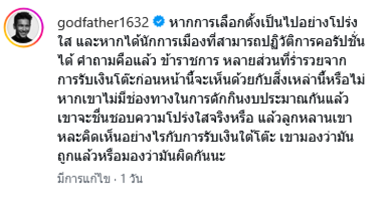 กลายเป็นประเด็นร้อนบนโลกโซเชียลทันที เมื่อพระเอกดังอย่าง ก๊อต จิรายุ ได้ออกมาโพสต์ข้อความสะท้อนมุมมองทางการเมืองและสังคมท่ามกลางบรรยากาศการใกล้การเลือกตั้งนายกรัฐมนตรีที่กำลังเข้มข้นระบุว่า