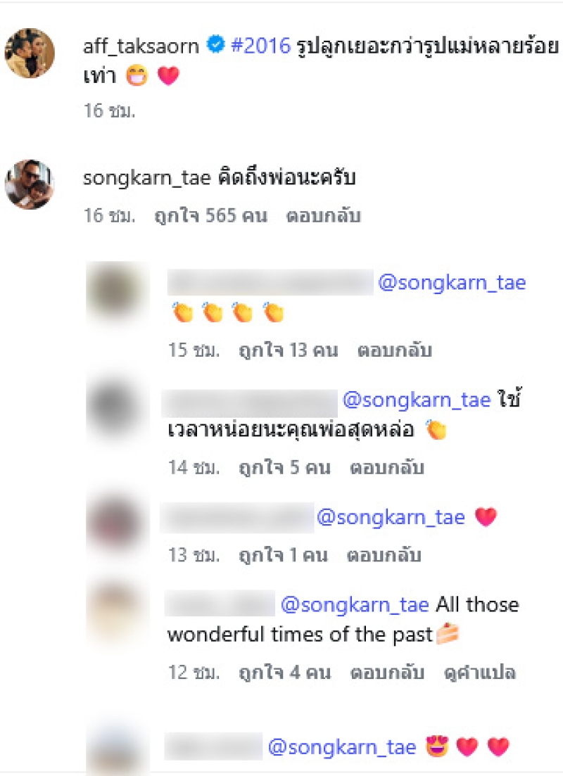 พร้อมแคปชั่นระบุว่า #2016 รูปลูกเยอะกว่ารูปแม่หลายร้อยเท่า งานนี้ทำเอา สงกรานต์ เข้ามาคอมเมนต์ภาพคุณพ่อของแอฟทันทีว่า คิดถึงพ่อนะครับ โดยมีแฟนๆต่างเข้ามาตอบคอมเมนต์เป็นกำลังใจอย่างมาก