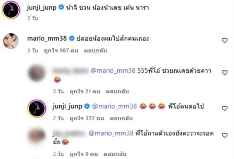 หนึ่งในคอมเมนต์ที่สะดุดตาที่สุดหนีไม่พ้นพระเอกหนุ่ม มาริโอ้ เมาเร่อ ที่เข้ามาแซวแบบขำๆ ด้วยประโยคสั้นๆ แต่เรียกเสียงหัวเราะจากชาวเน็ตได้ไม่น้อย