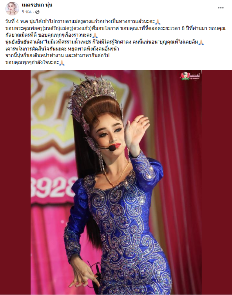 จากกรณีที่มีดราม่ามาสักพัก อย่าง นุ่น เนตรชนก หรือหลายๆคนรู้จักในบทของ ดำดง ที่ก่อนหน้านั้นได้ไลฟ์สดและเล่าพร้อมลาออกจากคณะลิเกศรรามน้ำเพรช จนทำให้มีประเด็นต่างๆตามมา ล่าสุด ทางนุ่นก็ได้เคลื่อยไหว พร้อมโพสต์ผ่านทางfacebook เนตรชนก นุ่น พร้อมระบุข้อความว่า วันที่ 4 พ.ค นุ่นได้เข้าไปกราบลาแม่ครูดวงแก้วอย่างเป็นทางการแล้วนะคะ ขอบพระคุณพ่อครู(มนต์รัก)แม่ครู(ดวงแก้ว)ที่มอบโอกาศ ขอบคุณเวทีนี้ตลอดระยะเวลา 8 ปีที่ผ่านมา ขอบคุณกัลยาณมิตรที่ดี ขอบคุณทุกๆเรื่องราวนะคะ