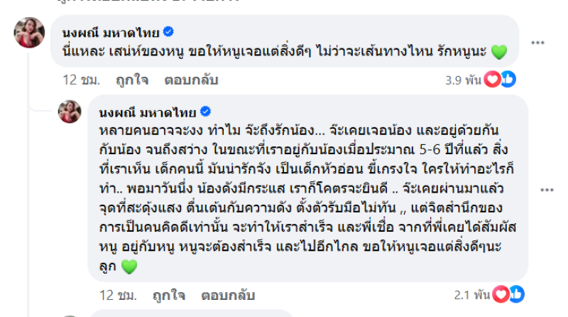 โดยทางนักร้องลูกทุ่งชื่อดัง อย่าง จ๊ะ นงผณี มหาดไทย ได้มาคอมเมนต์และเผยสาเหตุอีกมุมและสาเหตุทำไมถึงรัก นุ่น โดยจ๊ะได้ระบุข้อความว่า หลายคนอาจจะงง ทำไม จ๊ะถึงรักน้อง… จ๊ะเคยเจอน้อง และอยู่ด้วยกันกับน้อง จนถึงสว่าง ในขณะที่เราอยู่กับน้องเมื่อประมาณ 5-6 ปีที่แล้ว สิ่งที่เราเห็น เด็กคนนี้ มันน่ารักจัง เป็นเด็กหัวอ่อน ขี้เกรงใจ ใครให้ทำอะไรก็ทำ.. พอมาวันนึ่ง น้องดังมีกระแส เราก็โคตรจะยินดี .. จ๊ะเคยผ่านมาแล้ว จุดที่สะดุ้งแสง ตื่นเต้นกับความดัง ตั้งตัวรับมือไม่ทัน ,, แต่จิตสำนึกของการเป็นคนคิดดีเท่านั้น จะทำให้เราสำเร็จ และพี่เชื่อ จากที่พี่เคยได้สัมผัสหนู อยู่กับหนู หนูจะต้องสำเร็จ และไปอีกไกล ขอให้หนูเจอแต่สิ่งดีๆนะลูก