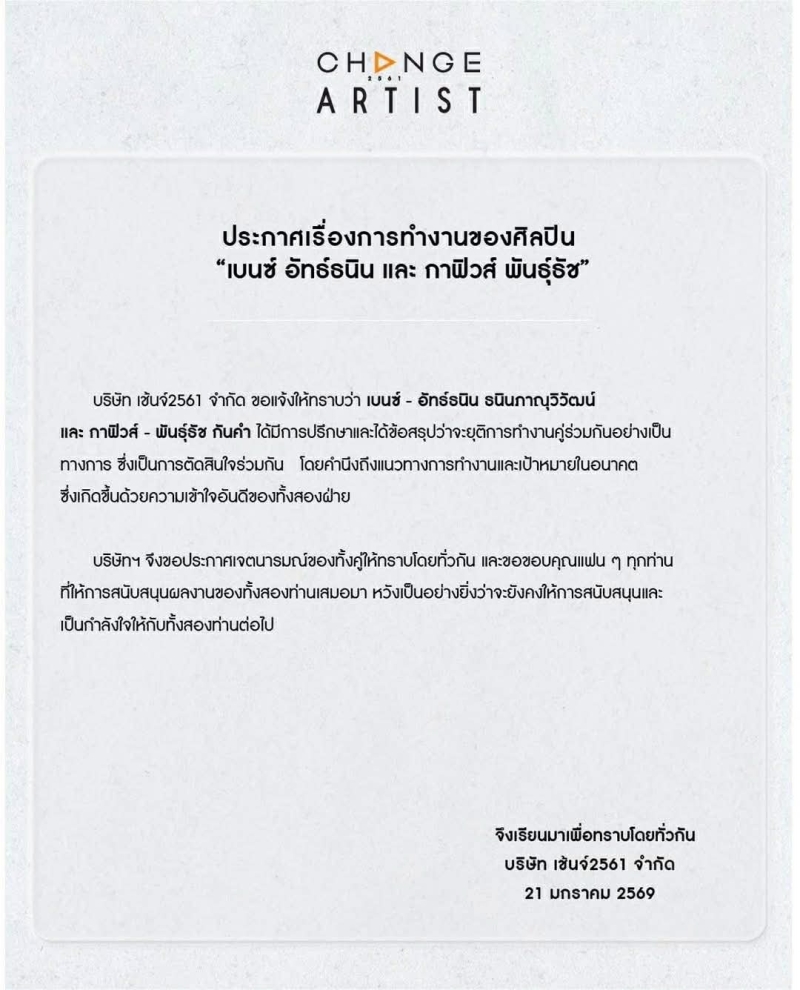 ขณะเดียวกัน ปิง โอบนิธิ และ นัท ศุภณัฐ ก็ได้ข้อสรุปในทิศทางเดียวกัน เป็นการแยกย้ายในเชิงงานอย่างเป็นมิตร ไม่มีประเด็นความขัดแย้งใดๆ