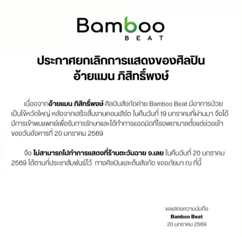 ขณะที่แฟนคลับต่างเข้ามาคอมเมนต์ให้กำลังใจอย่างต่อเนื่อง ขอให้ อ้ายแมน หายป่วยไว และกลับมาสร้างรอยยิ้มบนเวทีอีกครั้ง ท่ามกลางกระแสความห่วงใยที่หลั่งไหลไม่ขาดสาย