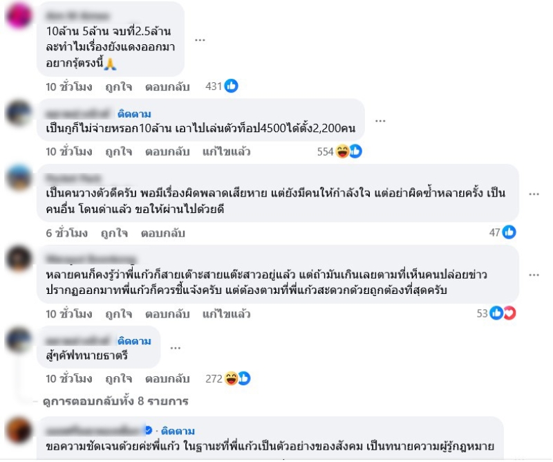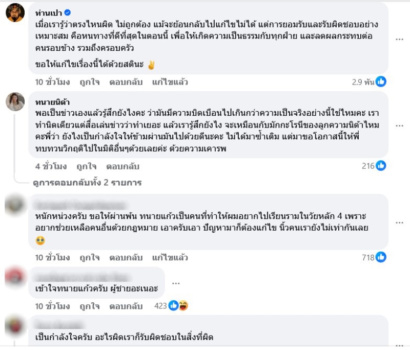 งานนี้ ทั้งเพจดังทั้งชาวดน็ต แห่เข้ามาคอมเมนต์กันเพียบ ร่วมถึงทนายนิด้าก็ได้เข้ามาคอมเมนต์ว่า พอเป็นข่าวเองแล้วรู้สึกยังไงคะ ว่ามันมีความบิดเบือนไปเกินกว่าความเป็นจริงอย่างนี้ใช่ไหมคะ เราทำนิดเดียวแต่สื่อเล่นข่าวว่าทำเยอะ แล้วเรารู้สึกยังไง จะเหมือนกับมักกะโรนีของลูกความนิด้าไหมคะพี่ว่า ยังไงเป็นกำลังใจให้ข้ามผ่านมันไปด้วยดีนะคะ ไม่ได้มาซ้ำเติม แต่มาขอโอกาสนี้ให้พี่ทบทวนวิกฤติไปในมิติอื่นๆด้วยเลยค่ะ ด้วยความเคารพ