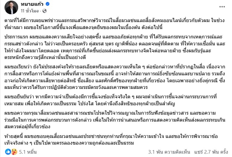 ผมขอยืนยันว่า หากมีความจำเป็นต้องมีการชี้แจงข้อเท็จจริงใด ๆ ผมจะดำเนินการชี้แจงผ่านกระบวนการที่เหมาะสม เพื่อให้เกิดความเป็นธรรม โปร่งใส โดยคำนึงถึงสิทธิของทุกฝ่ายเป็นสำคัญ