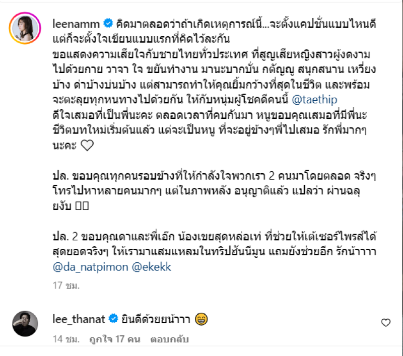 เรียกได้ว่า เป็รอีกหนึ่งนักร้องสาวสวย อย่าง น้ำ กัญญ์กุลณัช ปัญญากิตตินันท์ ที่ล่าสุดได้ประกาศข่าวดีกับแฟนหนุ่มที่คบหาดูใจกันมานานพอควร โดยเจ้าตัวได้โพสต์ผ่านทางอินสตาแกรม พร้อมระบุข้อความว่า คิดมาตลอดว่าถ้าเกิดเหตุการณ์นี้...จะตั้งแคปชั่นแบบไหนดี แต่ก็จะตั้งใจเขียนแบบแรกที่คิดไว้ละกัน ขอแสดงความเสียใจกับชายไทยทั่วประเทศ ที่สูญเสียหญิงสาวผู้งดงามไปด้วยกาย วาจา ใจ ขยันทำงาน มานะบากบั่น กตัญญู สนุกสนาน เหวี่ยงบ้าง ด่าบ้างบ่นบ้าง แต่สามารถทำให้คุณยิ้มกว้างที่สุดในชีวิต และพร้อมจะตะลุยทุกหนทางไปด้วยกัน ให้กับหนุ่มผู้โชคดีคนนี้ @taethip ดีใจเสมอที่เป็นพี่นะคะ ตลอดเวลาที่คบกันมา หนูขอบคุณเสมอที่มีพี่นะ ชีวิตบทใหม่เริ่มต้นแล้ว แต่จะเป็นหนู ที่จะอยู่ข้างๆพี่ไปเสมอ รักพี่มากๆนะคะ