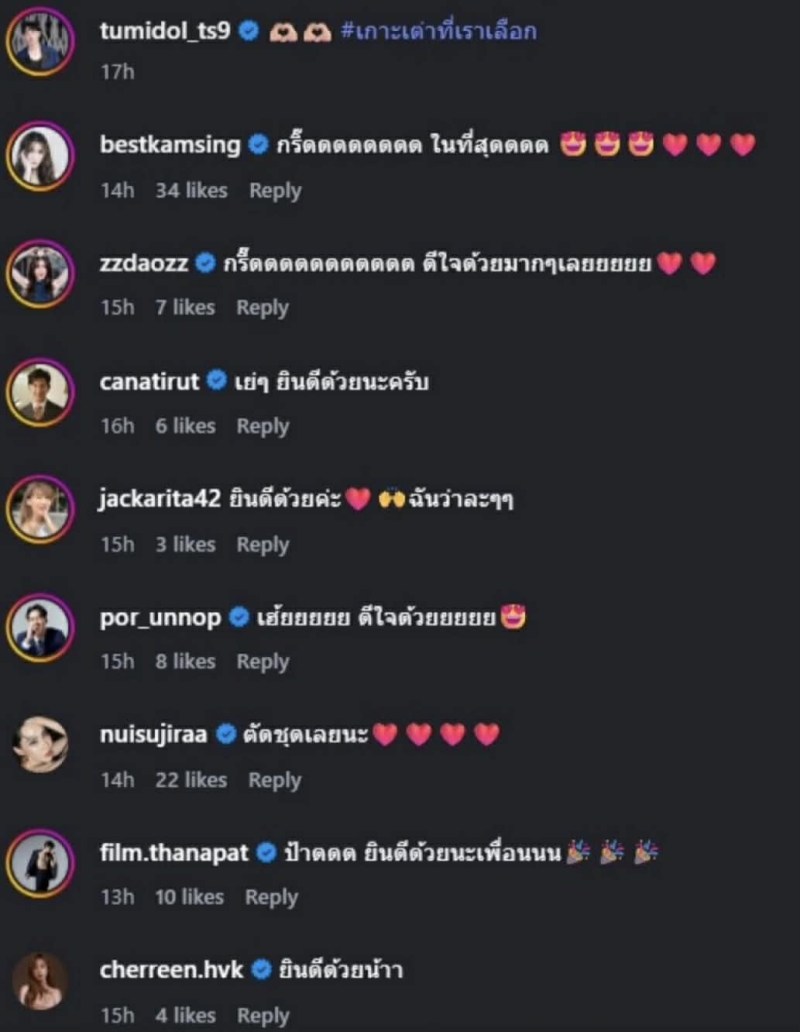 ด้านแฟนคลับ และคนในวงการ ต่างพร้อมใจกันเข้ามาแสดงความยินดีอย่างล้นหลาม พร้อมส่งคำอวยพรให้ทั้งคู่ก้าวสู่เส้นทางชีวิตคู่ด้วยความรัก ความอบอุ่น และความสุขในอนาคต