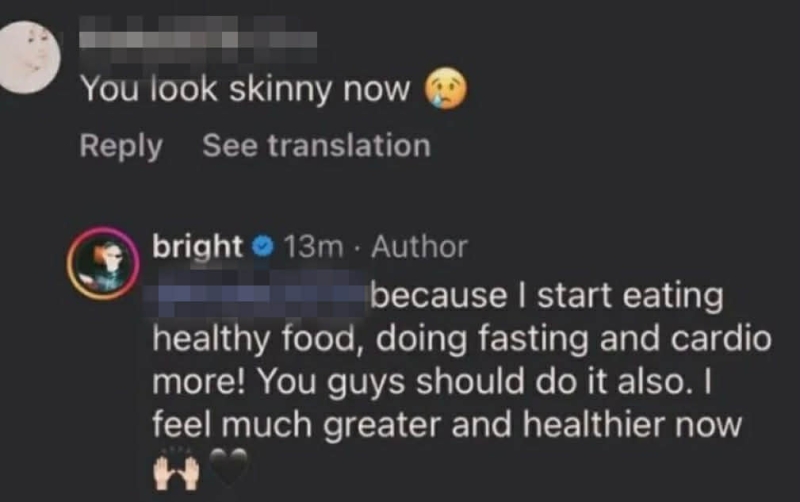 ต่อมา ไบร์ท ได้ออกมาชี้แจงผ่านการพูดคุยกับแฟนๆ โดยเผยว่า การเปลี่ยนแปลงครั้งนี้ เป็นผลจากการหันมาดูแลสุขภาพอย่างจริงจังมากขึ้น