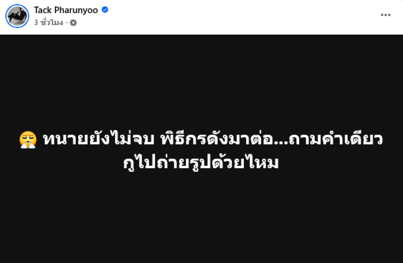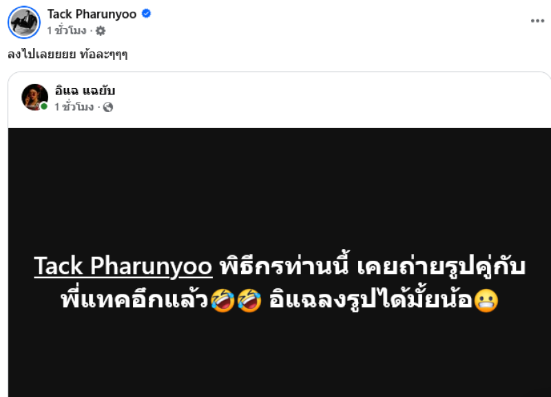 ล่าสุด แทค ภรัณยู ได้ออกมาโพสต์ถึงประเด็นดังกล่าวระบุว่า ทนายยังไม่จบ พิธีกรดังมาต่อ…ถามคำเดียวกูไปถ่ายรูปด้วยไหม ต่อมาเพจดัง อิแฉ แฉยับ โพสต์ว่า พิธีกรท่านนี้ เคยถ่ายรูปคู่กับพี่แทคอึกแล้ว อิแฉลงรูปได้มั้ยน้อ