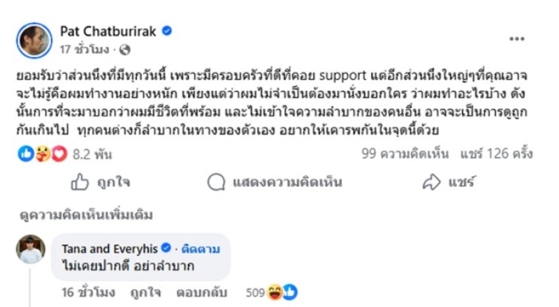 เรียกได้ว่า เป็นอีกครอบครัวที่แฟนๆชอบมาก และใครที่แฟนคลับจะรู้ดีว่า บ้านนี้นั้นแฮปปี้มากและตลกสุดๆ แต่ล่าสุด ทาง ภัทร ฉัตรบริรักษ์ ได้ออกมาโพสต์เดือดว่า ยอมรับว่าส่วนนึงที่มีทุกวันนี้ เพราะมีครอบครัวที่ดีที่คอย support แต่อีกส่วนนึงใหญ่ๆที่คุณอาจจะไม่รู้คือผมทำงานอย่างหนัก เพียงแต่ว่าผมไม่จำเป็นต้องมานั่งบอกใคร ว่าผมทำอะไรบ้าง ดังนั้นการที่จะมาบอกว่าผมมีชีวิตที่พร้อม และไม่เข้าใจความลำบากของคนอื่น อาจจะเป็นการดูถูกกันเกินไป ทุกคนต่างก็ลำบากในทางของตัวเอง อยากให้เคารพกันในจุดนี้ด้วย