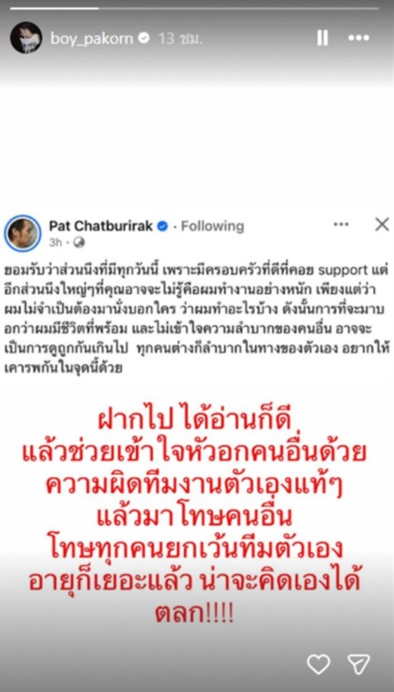 ด้านพี่ชายคนโตอย่าง บอย ปกรณ์ ก็ไม่น้อยหน้า ได้แชร์โพสต์ต้นทางของ ภัทร น้องชายพร้อมข้อความที่ว่า ฝากไปได้อ่านก็ดี แล้วช่วยเข้าใจหัวอกคนอื่นด้วย ความผิดทีมงานตัวเองแท้ๆ แล้วมาโทษคนอื่น โทษทุกคนยกเว้นทีมตัวเอง อายุก็เยอะแล้ว น่าจะคิดเองได้ ตลก