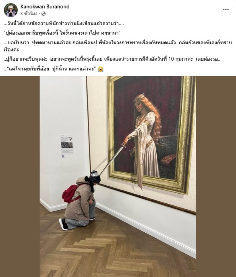 ล่าสุด ทาง ปู กนกวรรณ ได้โพสต์อีกครั้งว่า วันนี้ได้อ่านข้อความพี่นักข่าวท่านนึงเขียนแล้วความว่า…. “ปูต้องออกมารีบพูดเรื่องนี้ ไม่งั้นคนจะเดาไปต่างๆนานา” ขอเรียนว่า ปูพูดมานานแล้วค่ะ กลุ่มเพื่อนปู พี่น้องในวงการทราบเรื่องกันหมดแล้ว กลุ่มก๊วนของพี่เองก็ทราบเรื่องค่ะ ปูก็อยากจะรีบพูดค่ะ อยากจะพูดวันนี้พรุ่งนี้เลย เพียงแต่ว่ารายการมีคิวอัดวันที่ 10 กุมภาค่ะ เลยต้องรอ.. “แค่โทรคุยกับพี่อ้อย ปูก็น้ำตาแตกแล้วค่ะ”