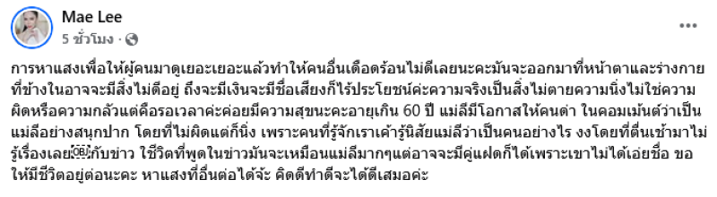 อายุเกิน 60 ปี แม่ลีมีโอกาสให้คนด่า ในคอมเมนต์ว่าเป็นแม่ลีอย่างสนุกปาก โดยที่ไม่ผิดแต่ก็นิ่ง เพราะคนที่รู้จักเราเค้ารู้นิสัยแม่ลีว่าเป็นคนอย่างไร งงโดยที่ตื่นเช้ามาไม่รู้เรื่องเลยกับข่าวชีวิตที่พูดในข่าวมันจะเหมือนแม่ลีมากๆ แต่อาจจะมีคู่แฝดก็ได้เพราะเขาไม่ได้เอ่ยชื่อ ขอให้มีชีวิตอยู่ต่อนะคะ หาแสงที่อื่นต่อได้จ้ะ คิดดีทำดีจะได้ดีเสมอค่ะ