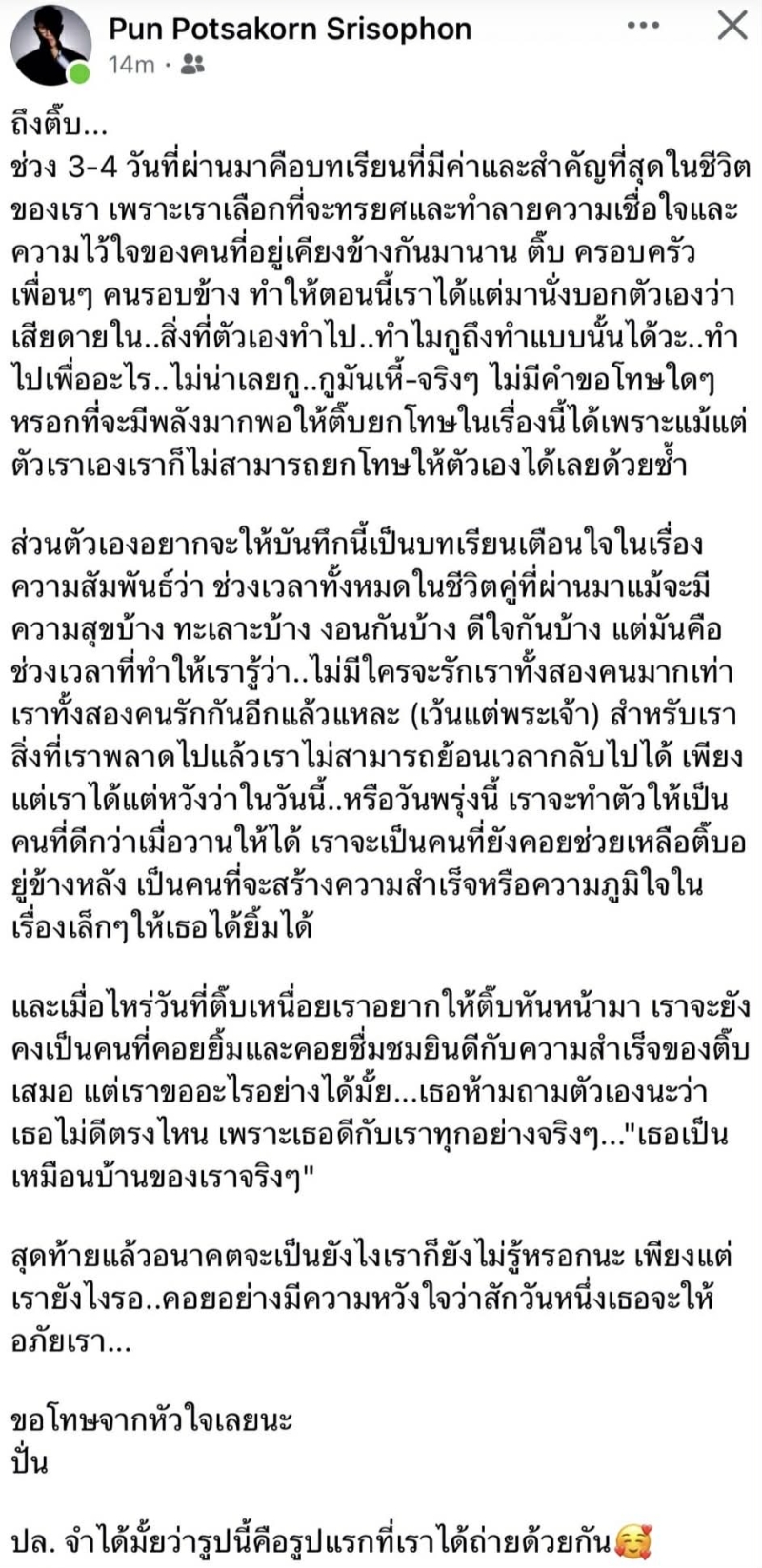 ในช่วงท้ายของข้อความ ปั่น ส่งสารถึงกระติ๊บ ว่า เธอ ไม่ควรโทษตัวเอง พร้อมย้ำว่า เธอ เป็นคนที่ดีมาโดยตลอด และปิดท้ายด้วยความหวังเล็กๆ ว่า สักวันหนึ่งอาจได้รับการให้อภัยอีกครั้ง พร้อมแนบภาพความทรงจำแรกของทั้งคู่ เป็นสัญลักษณ์ของอดีตที่ยังคงฝังใจ