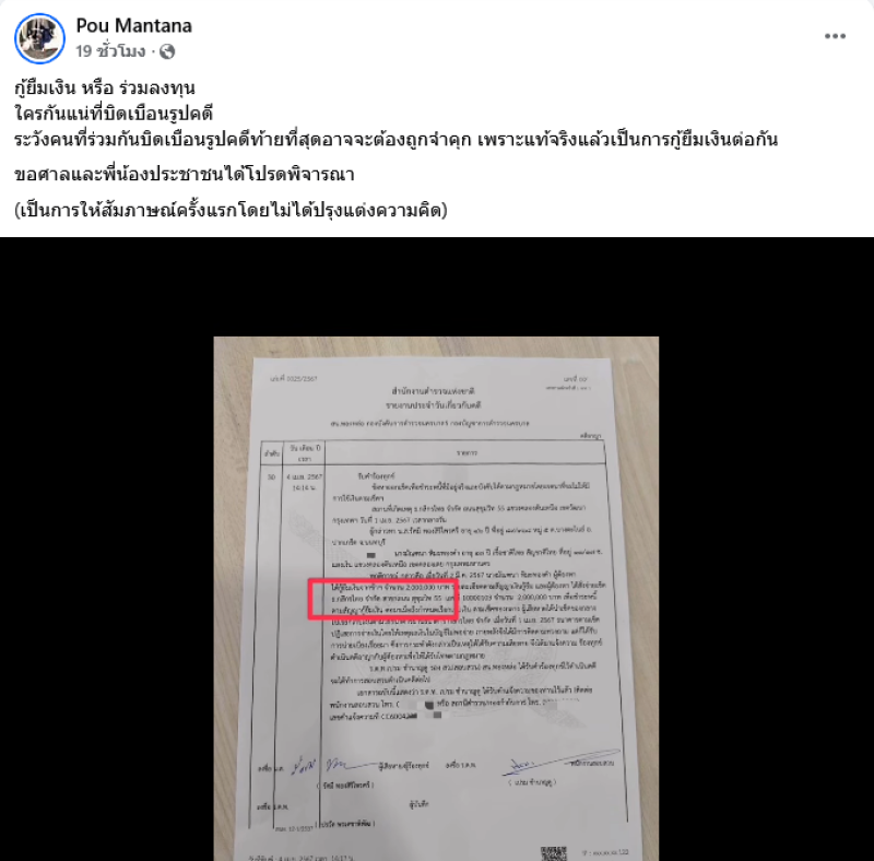 ล่าสุด ปู มัณฑนา โต้กลับทันทีระบุว่า ยืมเงิน หรือ ร่วมลงทุน ใครกันแน่ที่บิดเบือนรูปคดี ระวังคนที่ร่วมกันบิดเบือนรูปคดีท้ายที่สุดอาจจะต้องถูกจำคุก เพราะแท้จริงแล้วเป็นการกู้ยืมเงินต่อกัน ขอศาลและพี่น้องประชาชนได้โปรดพิจารณา (เป็นการให้สัมภาษณ์ครั้งแรกโดยไม่ได้ปรุงแต่งความคิด)