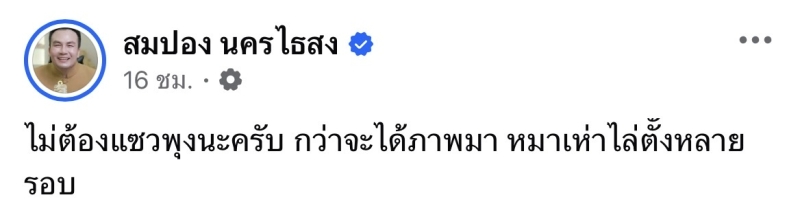 ไฮไลต์ที่ทำให้โพสต์กลายเป็นไวรัล คือ ข้อความประกอบภาพของสมปอง ที่ออกตัวแรงขอร้องชาวเน็ตอย่าแซวรูปร่าง พร้อมเล่าเบื้องหลังการถ่ายทำสุดอลหม่าน เรียกรอยยิ้มจากผู้ที่ได้อ่านเป็นอย่างดี