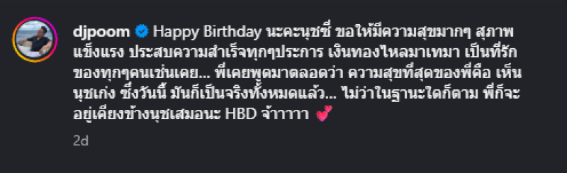 ล่าสุด ทำเอาแฟนๆต่างเชียร์อีกครั้ง เมื่อ ดีเจภูมิ โพสต์ IG @djpoom เผยภาพของนุช พร้อมข้อความอวยพรวันเกิดในฐานะพี่ชาย ระบุว่า "Happy Birthday นะคะนุชซี่ ขอให้มีความสุขมากๆ สุภาพแข็งแรง ประสบความสำเร็จทุกๆประการ เงินทองไหลมาเทมา เป็นที่รักของทุกๆคนเช่นเคย... พี่เคยพูดมาตลอดว่า ความสุขที่สุดของพี่คือ เห็นนุชเก่ง ซึ่งวันนี้ มันก็เป็นจริงทั้งหมดแล้ว... ไม่ว่าในฐานะใดก็ตาม พี่ก็จะอยู่เคียงข้างนุชเสมอนะ HBD จ้าาาาา"