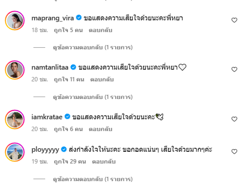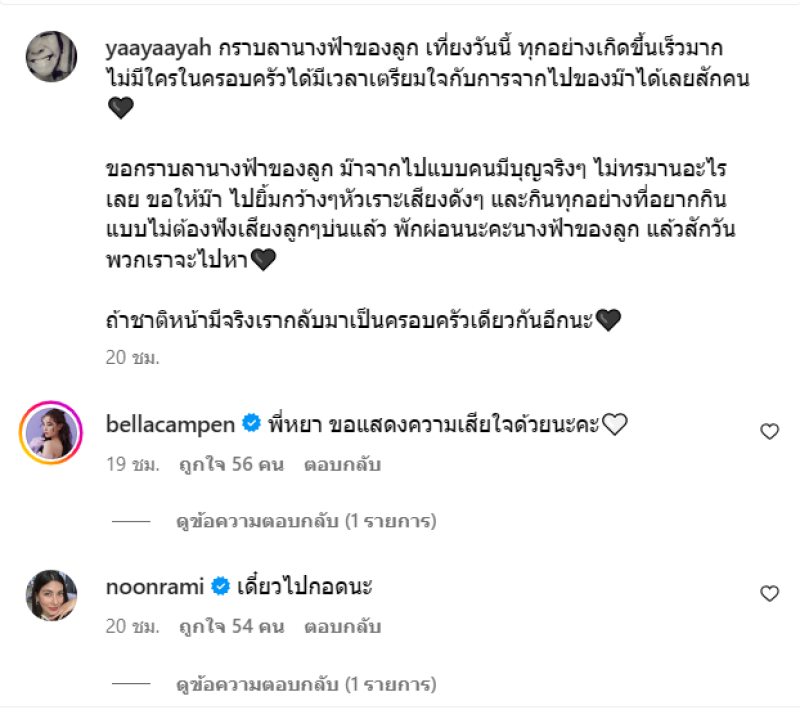 ท่ามกลาง เหล่าคนในวงการมาแสดงความเสียใจ ร่วมไปถึงนางเอก เบลล่า ก็เข้ามาคอมเมนต์ว่า พี่หยา ขอแสดงความเสียใจด้วยนะคะ และมีชาวเน็ตร่วมอาลัยเช่นกัน