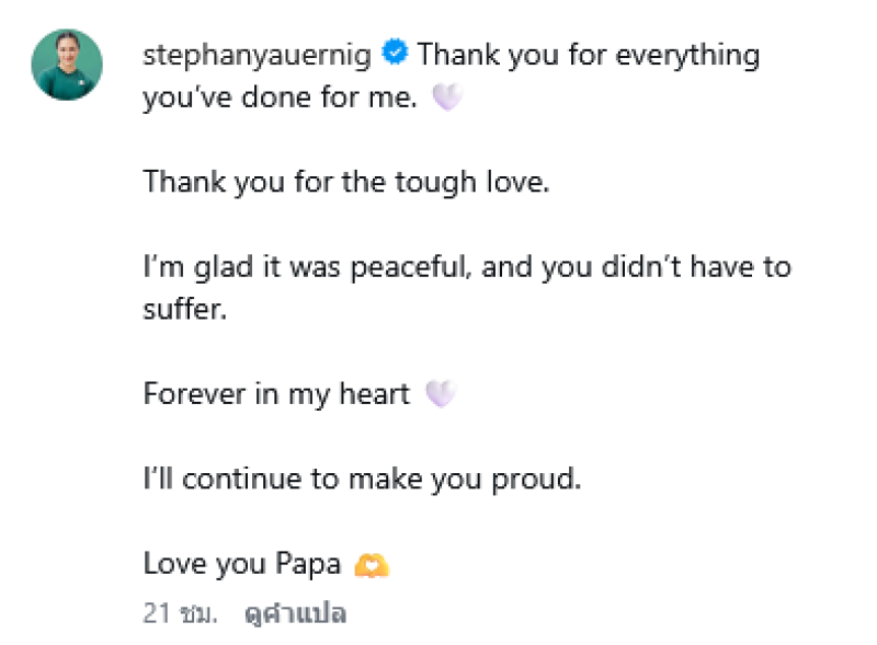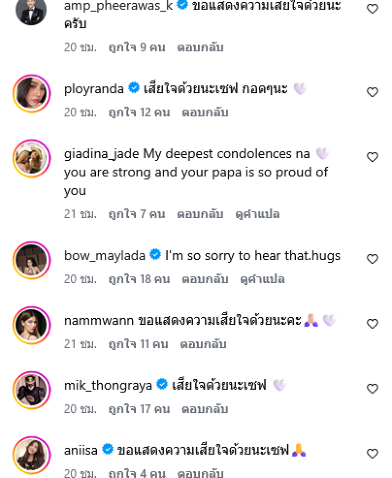 ขอบคุณสำหรับทุกสิ่งที่คุณทำเพื่อฉัน ขอบคุณสำหรับความรักที่เข้มงวด ฉันดีใจที่มันจบลงอย่างสงบ และคุณไม่ต้องทนทุกข์ทรมาน คุณจะอยู่ในใจฉันตลอดไป ฉันจะทำให้คุณภูมิใจต่อไป รักคุณ พ่อ ท่ามกลางคนในวงการต่างเข้ามาคอมเมนต์แสดงความเสียใจกันอย่างมาก