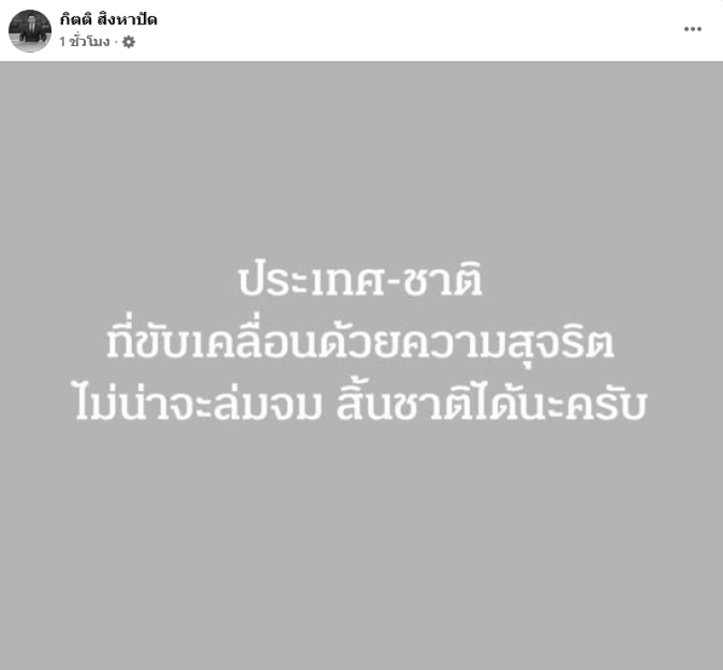 ล่าสุด ทาง กิตติ สิงหาปัด ผู้ประกาศดัง ได้ออกมาโพสต์สั้นๆว่า ประเทศ-ชาติ ที่ขับเคลื่อนด้วยความสุจริต ไม่น่าจะล่มจม สิ้นชาติได้นะครับ