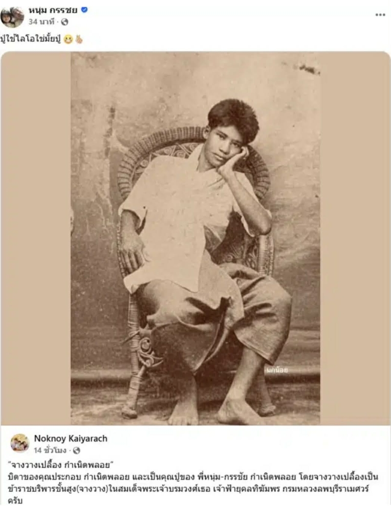 ภาพดังกล่าวเผยให้เห็น จางวางเปลื้อง กำเนิดพลอย บุคคลสำคัญในสายตระกูล ผู้เคยรับราชการในตำแหน่งข้าราชบริพารชั้นสูง สะท้อนถึงประวัติครอบครัวที่ไม่ธรรมดาของพิธีกรคนดัง อย่าง หนุ่ม