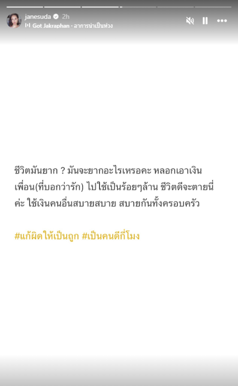 ล่าสุด เจนสุดา ได้ออกมาโพสต์อีกครั้ง แต่บอกเลยว่า เผ็ดเวอร์ โดยได้เผยว่า “ชีวิตมันยาก? มันจะยากอะไรเหรอคะ หลอกเอาเงินเพื่อน (ที่บอกว่ารัก) ไปใช้เป็นร้อยๆ ล้าน ชีวิตดีจะตายนี่ค่ะ ใช้เงินคนอื่นสบายสบาย สบายกันทั้งครอบครัว #แก้ผิดให้เป็นถูก #เป็นคนดีกี่โมง” พร้อมทั้งใส่เพลง "อาการน่าเป็นห่วง" ศิลปิน ก๊อท จักรพันธ์