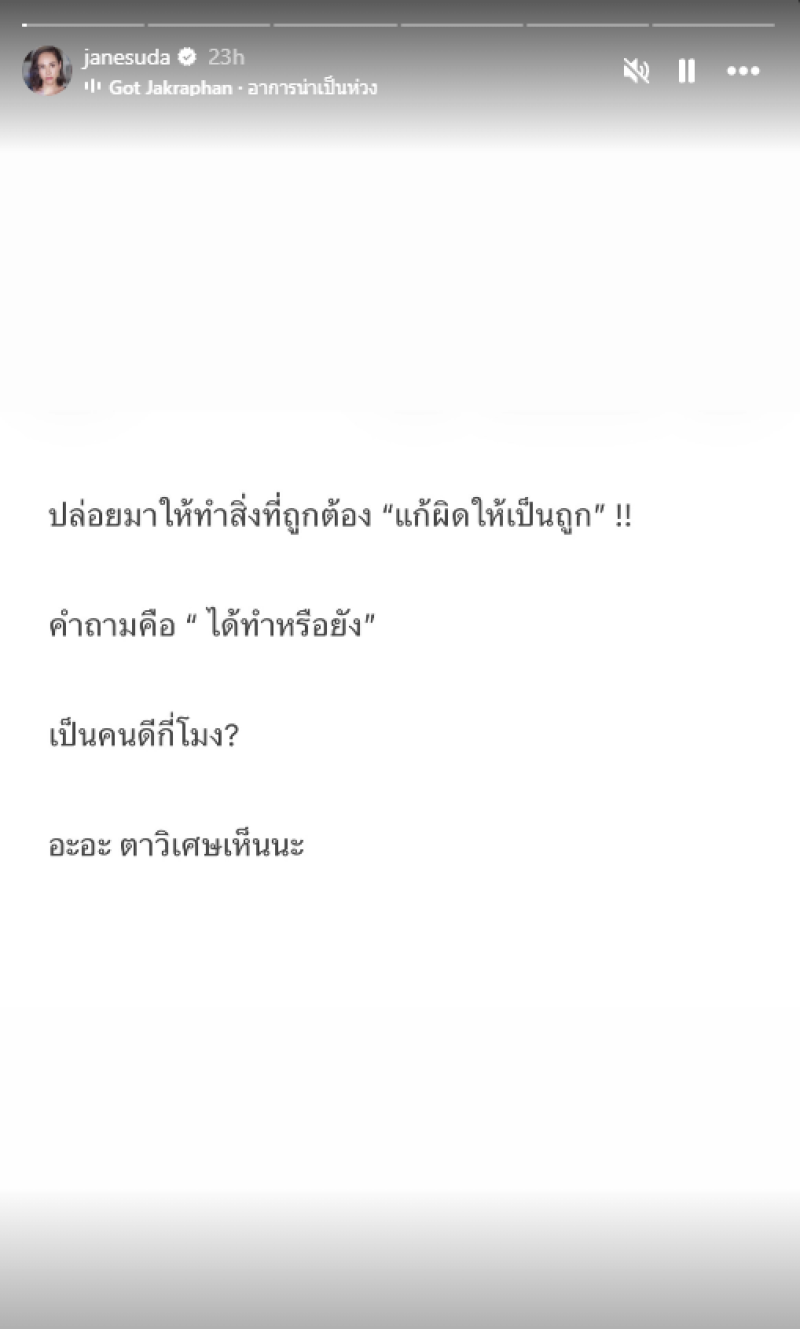 จากกรณีที่ก่อนหน้านั้น ทาง เจน เจนสุดา ปานโต โพสต์ข้อความผ่านไอจีสตอรี่ในลักษณะชวนให้ตีความ ว่า “ปล่อยมาให้ทำสิ่งที่ถูกต้อง 'แก้ผิดให้เป็นถูก' !! คำถามคือ 'ได้ทำหรือยัง' เป็นคนดีกี่โมง? อะอะ ตาวิเศษเห็นนะ” ทำเอาชาวเน็ต เอ๊ะ ยังไงนะ