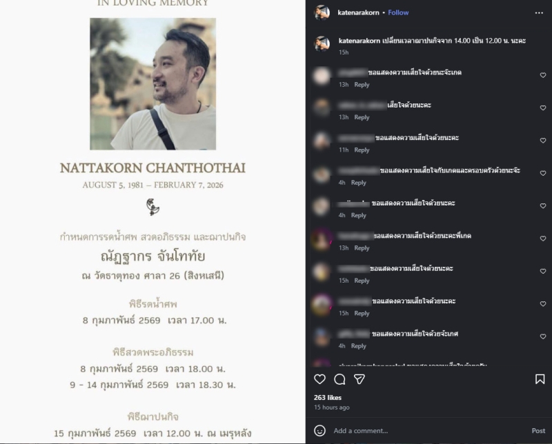 ท่ามกลาง เพื่อนในวงการบันเทิงและหลายคนที่ติดตามเธอต่างพากันเข้ามาคอมเมนต์แสดงความเสียใจ และส่งกำลังใจให้กับ เกด นารากร และครอบครัวโลหะชาละ