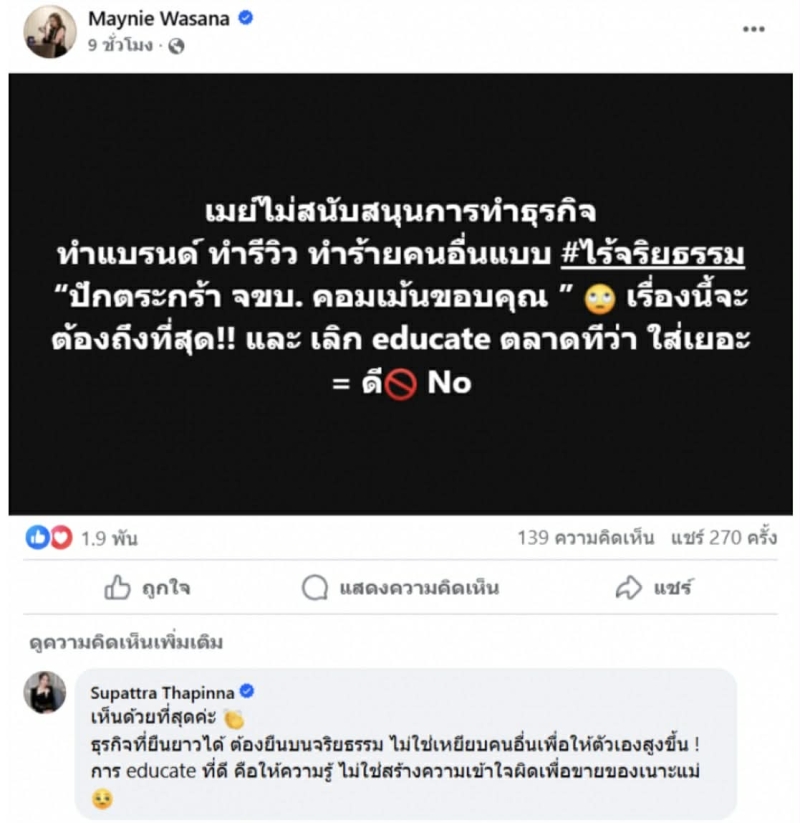 ฝั่ง เมย์ โพสต์ข้อความชัดเจนว่า ไม่เห็นด้วยกับการทำคอนเทนต์ขายของที่กระทบ หรือ พาดพิงผู้อื่น พร้อมย้ำว่า การทำธุรกิจควรแข่งขันกันอย่างสร้างสรรค์ ไม่ใช่ใช้วิธีลดคุณค่าแบรนด์อื่น เพื่อดันสินค้าตัวเอง