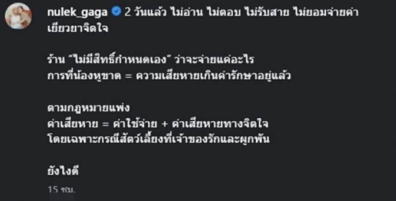 ต่อมา หนูเล็กนำภาพข้อความสนทนามาโพสต์ผ่านอินสตาแกรมส่วนตัว nulek_gaga ซึ่ง อีกฝ่ายระบุพร้อมรับผิดชอบค่ารักษาตามจริง แต่เธอมองว่า ความเสียหายไม่ได้จบแค่ค่าใช้จ่าย เพราะสิ่งที่เกิดขึ้นกระทบความรู้สึกอย่างมาก และต้องการตรวจสอบภาพจากกล้องวงจรปิดตั้งแต่เริ่มกระบวนการ