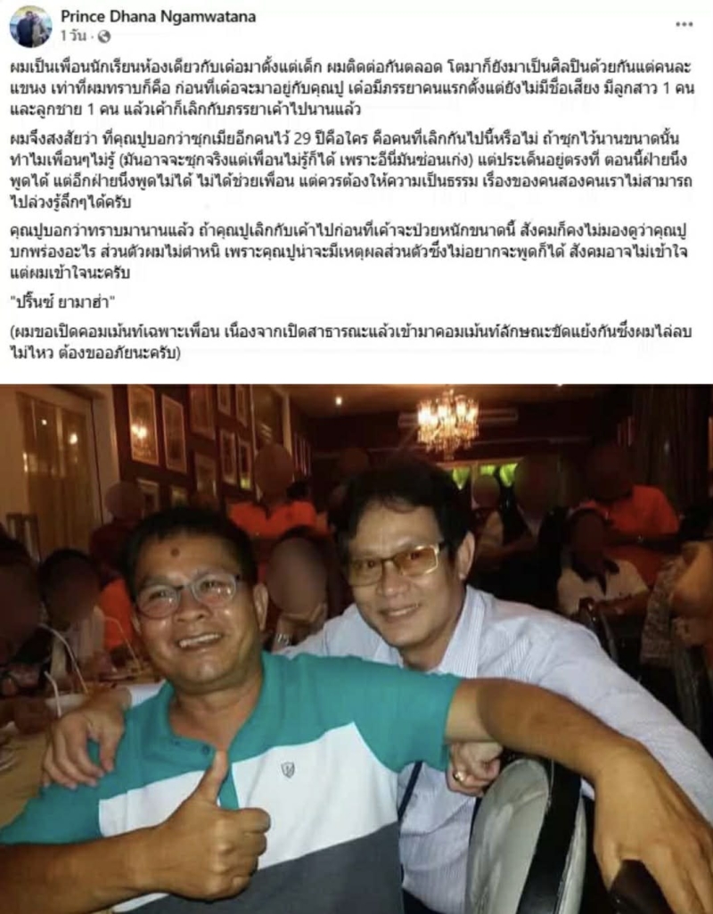 กระทั่ง ปริ๊นซ์ ยามาฮ่า เพื่อนเก่าสมัยเรียนของฝ่ายชาย ออกมาเคลื่อนไหวผ่านเฟซบุ๊ก เล่าย้อนความหลังว่า รู้จัก เด๋อ มาตั้งแต่ยังเป็นนักเรียน และติดต่อต่อเนื่องกันเสมอ พร้อมเผยข้อมูลว่า เด๋อ เคยมีครอบครัวมาก่อนเข้าวงการ มีลูกชาย และลูกสาว ก่อนจะแยกทางกับภรรยาคนแรกไปนานแล้ว