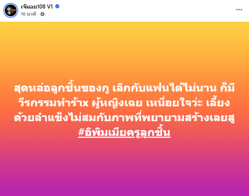 เรียกได้ว่า มีเรื่องมาให้ชาวเน็ตรู้อีกแล้ว เมื่อทางเพจดัง อย่าง เจ๊มอย108 V1 ได้ออกมาโพสต์ว่า สุดหล่อลูกชิ้นของกู เลิกกับแฟนได้ไม่นาน ก็มีวีรกรรมทำร้าx ผู้หญิงเฉย เหนื่อยใจว่ะ เลี้ยงด้วยลำแข็งไม่สมกับภาพที่พยายามสร้างเลยสู #อิพิมเมียครูลูกชิ้น