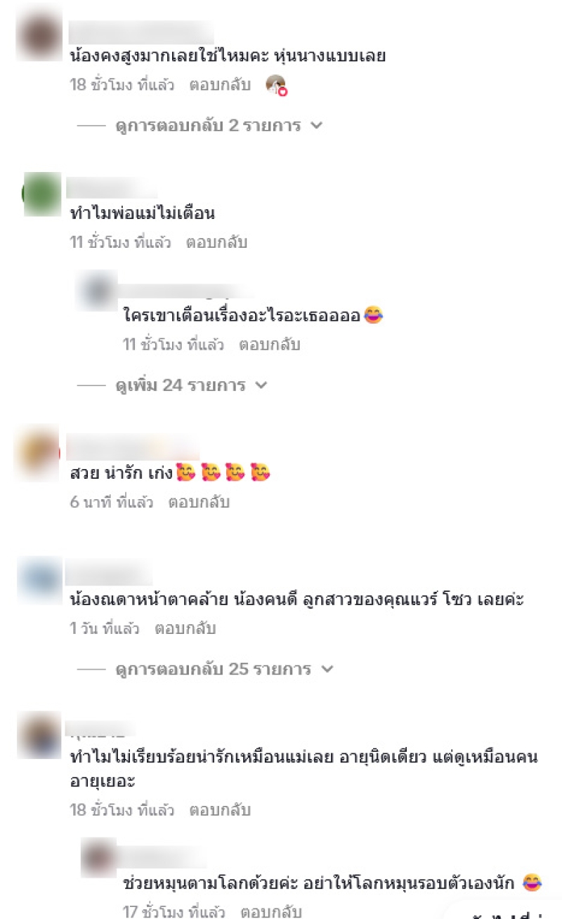 โดยมีชาวเน็ตบางส่วนเข้ามาคอมเมนต์ชื่นชมในความสวยกันไม่น้อย อาทิ ทำไมพ่อแม่ไม่เตือน,ทำไมไม่เรียบร้อยน่ารักเหมือนแม่เลย อายุนิดเดียว แต่ดูเหมือนคนอายุเยอะ,น้องเป็นคนน่ารักนะคะอยากให้โชว์แบบน่ารักมากกว่าค่ะ,ไม่มีใครเตือนน้องเลยหรอคะ,โตเร็วมากเลยค่ะสวยเหมือนคุณแม่เลยค่ะ