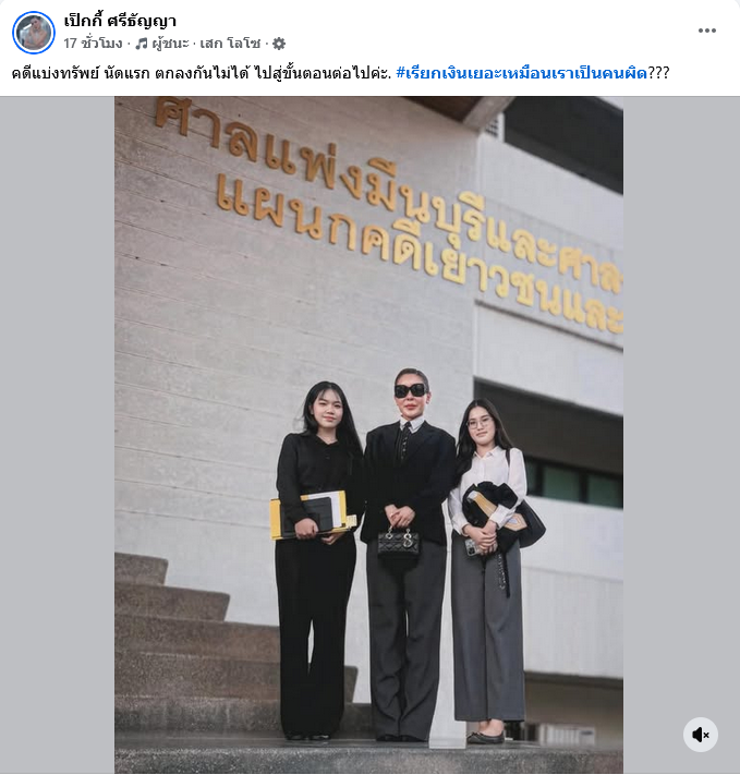 กรณีที่ก่อนหน้านั้น ทางดารา-พิธรกรดัง อย่าง เป็กกี้ ศรีธัญญา ถูกอดีตสามีฟ้องแบ่งทรัพย์สิน โดยได้ออกมาโพสต์ว่า กลับจากทำงานมา ได้รับหมายศาลจากคนในอดีต ฟ้องแบ่งทรัพย์สินป็กค่ะ (อีโมจิร้องไห้) พร้อมใส่แคปชั่นว่า ตัวเย็นไปหมดเลยค่ะ ใครมีเบอร์ทนายแก้วบ้างคะ?